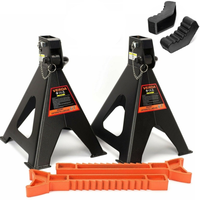 Zestaw dwóch podpór samochodowych o udźwigu 6T z blokadą zabezpioeczającą i gumą ochronna.