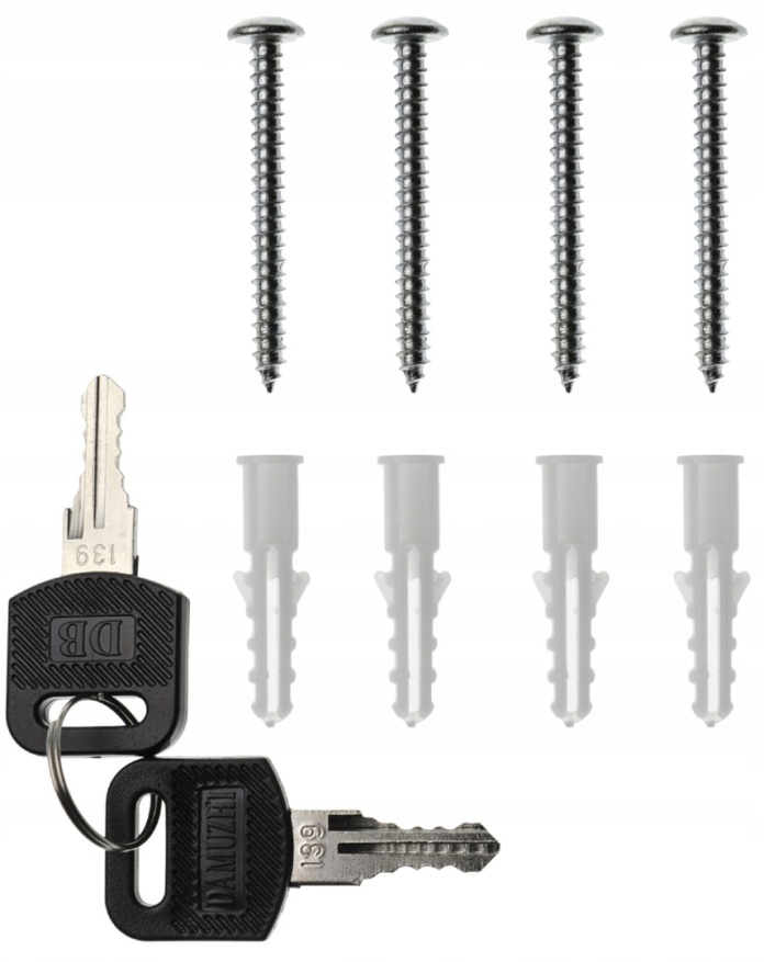 - Kołki rozporowe ze śrubami do montażu (4 szt.) oraz dwa klucze w zestawie.